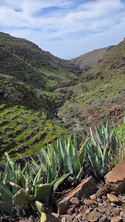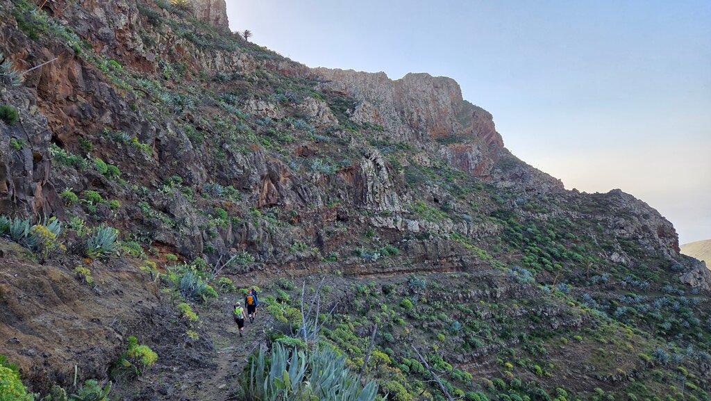 <Morgens um 09:30 Uhr Begrüßung durch den ASI Guide an der Hotelrezeption. Wir erscheinen zur Begrüßung bereits im Wanderoutfit mit unserer Ausrüstung, denn gleich im Anschluss starten wir zur ersten Wanderung. Im wildromantischen Bergdorf Pastrana beginnt unser Weg durch exotische Gärten, wo Papayas, Mangos und Avocados wachsen. Es geht hoch zum verlassenen Ort von Benchijigua, gesäumt von Palmen und dem beeindruckenden Fels Agando im Hintergrund. Das von Palmen gelegene Dorf Imada, erreichen wir durch eine steile Felswand mit ständigem Blick auf die Täler und das Meer.