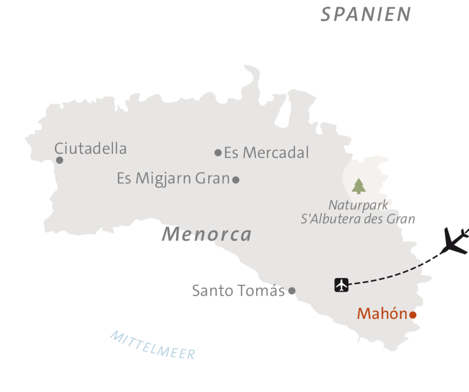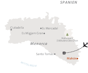 <Nach der Ankunft am Flughafen von Menorca werden wir von einem ASI-Vertreter empfangen und zu unserem Hotel gebracht. Dort können wir in Ruhe ankommen, auspacken und die ersten Eindrücke dieser mediterranen Insel sammeln. Wir treffen uns um 19 Uhr an der Rezeption zum gemeinsamen Kennenlernen.
