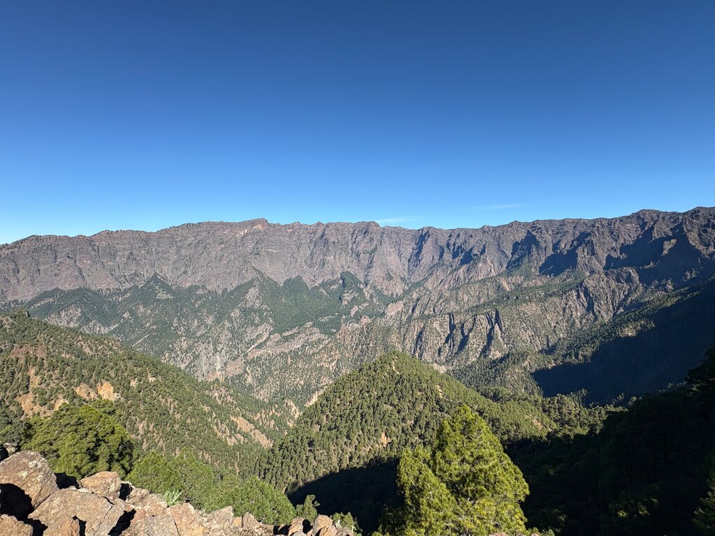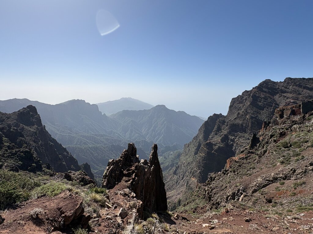 Vor uns breitet sich die wilde Bergregion der einstigen Ureinwohner, der Guanchen, aus. In der Ferne liegt das fruchtbare Aridanetal mit dem Dorf El Paso – ein beeindruckender Ausblick und ein unvergessliches Naturerlebnis, das die Vielfalt und Schönheit La Palmas zeigt.