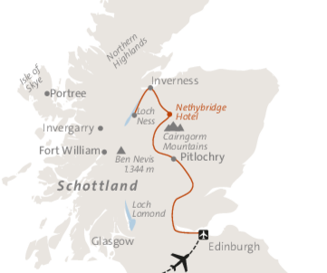 Nach der Ankunft erfolgt ein ca. 3-stündiger Transfer bis nach Nethy Bridge. Am ersten Abend treffen wir unseren Wanderführer an der Rezeption des Hotels und lernen uns bei einem gemeinsamen Abendessen kennen.