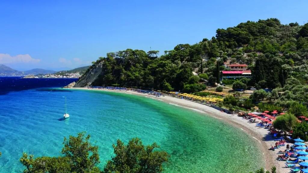 <Auf und ab durch Olivenhaine und Pinienwälder radeln wir vorbei an Mili zum Marien-Kloster Megali Panagia mit seinen bemerkenswerten Ikonen und von dort weiter nach Koumaradei, bekannt für seine Töpferwaren und das hervorragende Olivenöl. Nach der Mittagspause besuchen wir den Ort Spatharei und genießen eine kilometerlange Abfahrt zum Badeort Ireo. Am Ortsrand liegt das Heraion, das bedeutendste antike Heiligtum der Insel. -