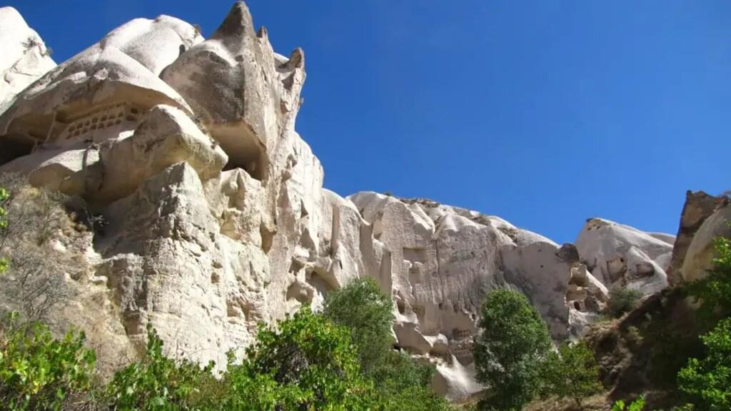 <Morgens bringt uns der Bus nach Kavak. Hier beginnt unsere Wanderung durch Gärten und Weinberge in Richtung des südlich gelegenen Dorfes Bahceli. Weiter geht es durch mehrere Täler. In Tuffstein gemeißelte Wohnungen säumen unseren Weg und kleine Bäche sorgen für Erfrischung. In einem der Täler suchen wir uns ein schönes Plätzchen und lassen unsere Umgebung bei einem ausgiebigen Picknick auf uns wirken. Wir erreichen das Dorf Ayvali und gehen weiter zum Gomede-Tal. Auch hier wurden Wohnungen und Kirchen aus den Steilwänden gehauen, ein Bach schlängelt sich durch den Talgrund. Unser Ziel ist das nahe gelegene Dorf Mustafapasa. Wir schlendern durch das Dorf und bewundern die zahlreichen Moscheen, Kirchen und die aus massiven Steinquadern gebauten Wohnhäuser. -