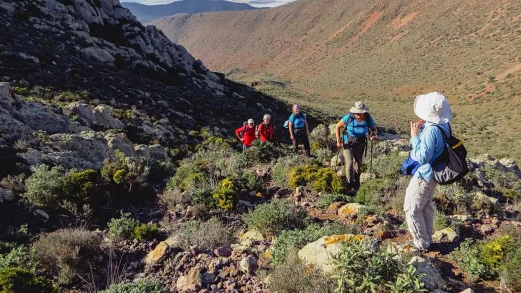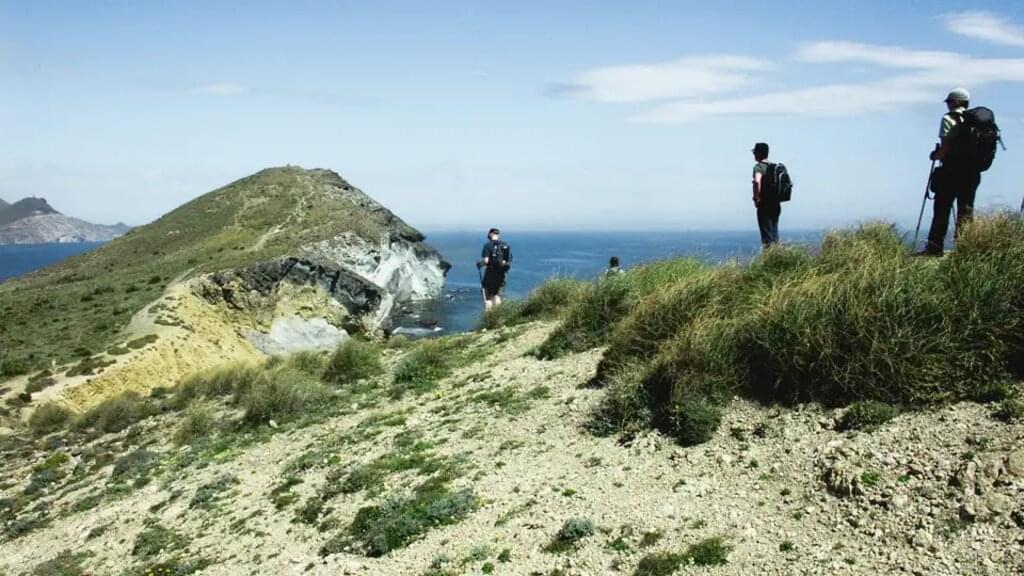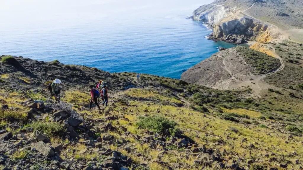 <Nach dem Frühstück besuchen wir den Botanischen Garten im nahen Rodalquilar und fahren anschließend auf der alten Minenstraße in das Herz des Naturparks. Wir steigen in der engen, schattigen und nach Norden ausgerichteten Schlucht von Requena mit ihrer nahezu "üppig-grünen Vegetation" im Vergleich mit der sonst eher kargen Landschaft, auf den Grad des Vulkankessels. Der Cerro Peñones (488 m) ist Teil des Kesselrandes der Caldera von Majada Redonda und bietet uns einen herrlichen Ausblick über den gesamten Naturpark und weite Teile seiner Küste. Von unserem luftigen Picknick Platz gehen wir den ersten Teil gemeinsam bis zum Einstieg in die Requenaschlucht zurück. Die geröllige Schlucht ist nicht für einen Abstieg geeignet, weshalb wir als Gruppe auf einem befestigtem Weg zum Fischerdorf La Isleta del Moro absteigen. Unsere Reiseleitung macht sich bereits auf den Weg zum Auto und trifft uns im Dorf wieder. Nach einer Pause mit Blick über die Bucht geht es zurück zu unserem Hotel. -