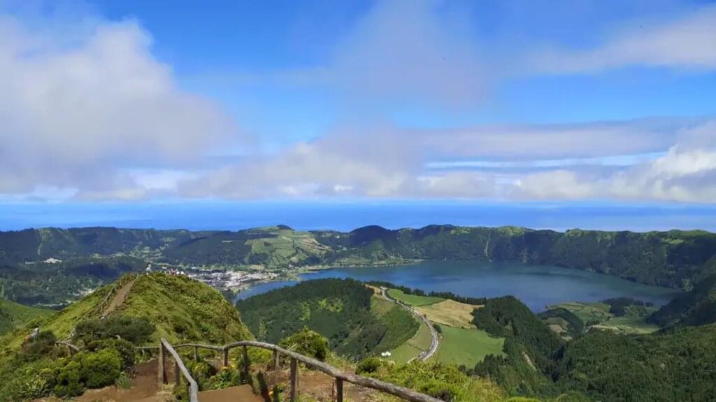 <Wir fahren hinauf zur Caldeira da Sete Cidades im Nordwesten der Insel. Auf dem Grund des riesigen Kraters ruht ein See, der von den zerklüfteten, von Bäumen und Blumen bewachsenen Kraterhängen umgeben ist. Um die Farben der beiden Teile des Sees Lagoa Azul (Blauer See) und Lagoa Verde (Grüner See) ranken sich verschiedene Legenden. Wie kommt es, dass der See zwei Farben hat? Unsere Wanderung führt am Kraterrand entlang und dann hinab zum direkt am See gelegenen Dorf Sete Cidades. Von dort werden wir wieder zurück zu unserem Hotel gefahren. -