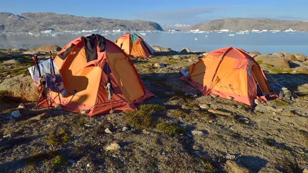 <Wir brechen unsere Zelte ab, verstauen das Gepäck im Boot und dann bringen uns die Inuit zu unserem ersten Camp in der Wildnis. Wir erreichen in einer versteckten Bucht auf einer der Küste vorgelagerten Insel den Apusiaajiik-Gletscher. Mit direktem Blick auf die Abbruchkante errichten wir unser Camp am Ufer. Vielleicht bleibt noch Zeit für eine kleine Erkundungstour vor dem Abendessen. Dann beobachten wir, wie die Sonne sich langsam für einige Stunden hinter den Felswänden zurückzieht. -