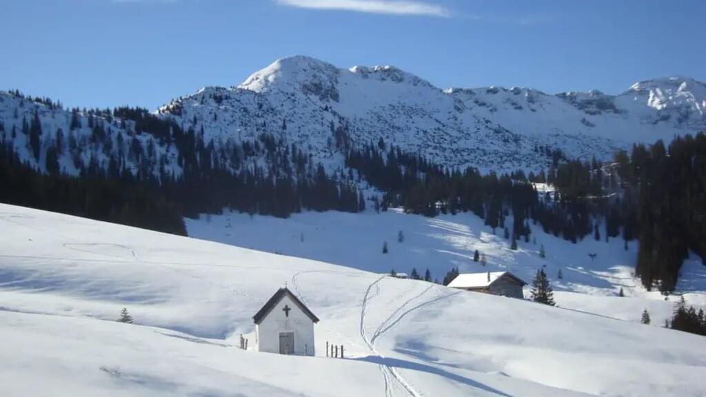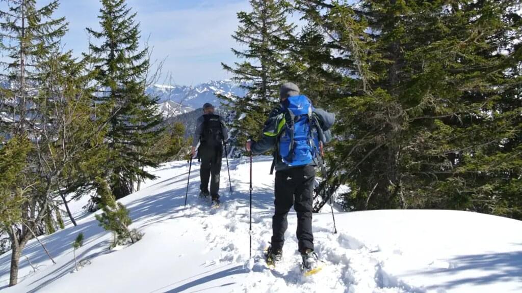 <Heute ist der 1863m hohe Roßkopf unser Tagesziel. Wir starten wieder direkt vom Hotel aus und nutzen die im Winter zur Rodelbahn präparierte Forststraße Richtung Schönalmjoch. Am Ende der Straße zweigen wir auf einen Bergrücken, der uns über lichte Wälder und tief verschneite Almwiesen höher bringt. Sobald wir aus den letzten Wäldern hinaustreten, wechseln wir die Richtung und spuren auf einem schönen freien Rücken hinauf bis zum Gipfel des Roßkopf. Der Ausblick hinunter in das stille, winterlich verschneite Risstal ist grandios. Nach einer ausgiebigen Rast treten wir wieder auf gleicher Strecke den Rückweg an. Sollten wir uns Schlitten (Zusatzkosten 7,-€/Pers. und Tag) vom Hotel ausgeliehen haben, können wir die letzten Höhenmeter bergab mit einer rasanten Abfahrt bewerkstelligen.