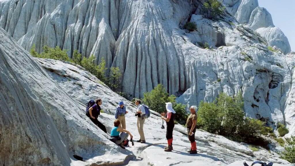 <Gleich hinter der Küstenlinie steigen die Felswände des Velebit-Gebirges steil in die Höhe und heute wollen wir das Gebiet erkunden. An einem Wanderparkplatz im Nationalpark Paklenica schnüren wir unsere Wanderstiefel. Über grüne Wiesen und durch üppige Macchia schlängelt sich unser Weg bergauf. Bald ändert sich die Landschaft, Steinriesen tauchen aus den Graslichtungen auf. Der Weg wird steiler und steiniger und schließlich taucht der Bojin Kuk (1.110 m) vor uns auf. Ein letzter teilweise mit Stahlseilen versicherter steiler Aufstieg über Kalksteinplatten und wir stehen auf dem Gipfel. Von hier oben haben wir einen atemberaubenden Blick auf die umliegenden Berge des Velebit, auf die roten Dächer von Zadar und die Inselwelt der Adria. Nach einer gemütlichen Rast steigen wir auf einem anderen Weg zur Ebene Velko Rujno ab. -