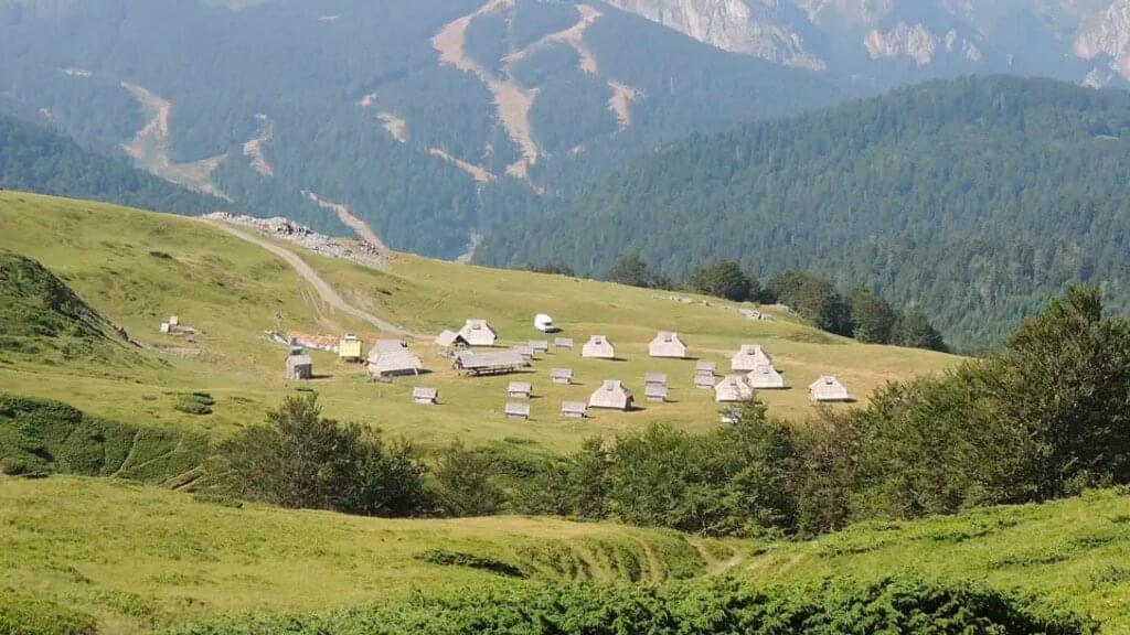 <Auf guten Wegen wandern wir heute ohne große Höhenunterschiede entlang des Bergzuges der Bjelasica. Almwiesen, weite Hochflächen und sanft abgerundete Gipfel prägen die fast baumlose Landschaft. Wunderbare Ausblicke auf die Seen, Täler und Gebirgszüge der Umgebung bieten sich uns fast auf der kompletten Route. Oberhalb des Almdorfes Vranjak wandern wir zum idyllischen Gletschersee Pesica, einer der vielen Seen im Bjelasica-Gebirge. Dieser ist der höchstgelegene und befindet sich unmittelbar zwischen den Gipfeln des Crna Glava (2.139 m) und Zekova Glava (2.122 m). Am Seeufer legen wir eine Pause ein, bevor wir über den Zekova Glava zur Alm Vranjak wandern. Hier wartet schon unser Bus und bringt uns ins Städtchen Kolasin, wo wir heute übernachten. -