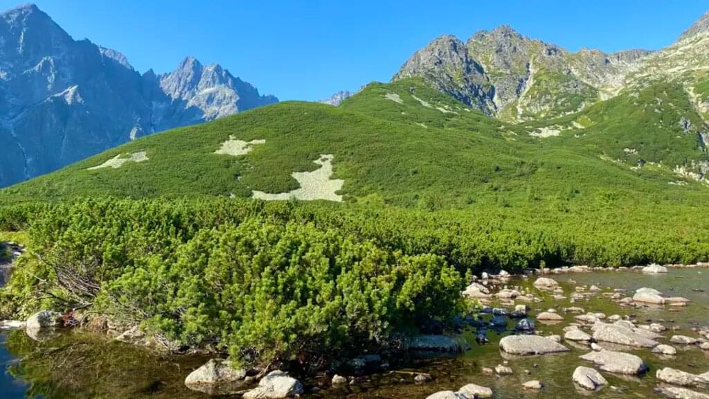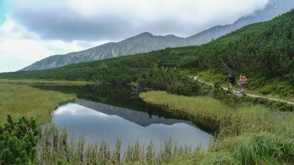 <Heute packen wir unser Rucksäcke für die nächsten zwei Wandertage. Unser Hauptgepäck lassen wir im Hotel. Dann fahren wir mit dem Bus auf die slowakische Seite der Tatra, nach Tatranská Kotlina. Der Weg führt uns durch dichten Mischwald hinein in die Weiße Tatra. Zur Mittagszeit erreichen wir die Berghütte Plesnivec, wo wir bei einer Pause die Aussicht ins Tal genießen. Am Nachmittag setzen wir unsere Wanderung fort und steigen über weite Hügel, die mit Latschen bewachsen sind, weiter auf, bis wir den Weißen Teich erreichen. Von dort ist es nur noch ein kurzer Weg zur gemütlichen Berghütte Pri Zelenom, in der wir heute übernachten. -