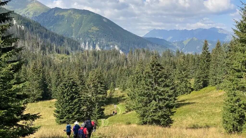 <Nach dem Frühstück fahren wir eine kurze Strecke bis nach Brzeziny, wo unsere heutige Wanderung beginnt. Über steinige Pfade und kleine Brücken steigen wir auf den Gipfel des Gęsia Szyja (1.489 m). Von oben genießen wir den Ausblick auf die beeindruckenden Gipfel der Hohen Tatra. Nach einem kurzen Abstieg erreichen wir die Rusinowa Lichtung, eine Hochalm, auf der im Sommer Schafherden grasen. Wer möchte, kann hier den typischen Schafskäse (Oscypek) probieren. Nach einer ausgiebigen Pause setzen wir unseren Abstieg fort und halten unterwegs an der Bergkirche Javorina. Durch das Zlota Tal gelangen wir schließlich nach Zazadnia, wo unser Bus bereits auf uns wartet. Nach drei erlebnisreichen Wandertagen haben wir uns eine kleine Pause verdient. Wer möchte, kann den Nachmittag im Thermalbad Bania genießen. Zum Abschluss des Tages fahren wir zu unserer Pension, wo wir uns zum Abendessen treffen. Den Abend lassen wir gemütlich bei einem Lagerfeuer am Fluss Bialka ausklingen. -