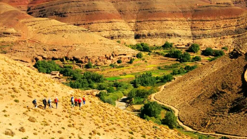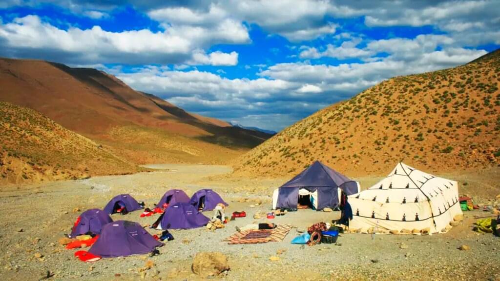 <Wir wandern zunächst entlang einer Bergquelle moderat ansteigend und dann hinunter ins Oulilimt-Tal. Es geht vorbei an Nomadensiedlungen und imposanten Steinformationen am Fuße eines Höhenkamms. Beim alten Getreidespeicher von Ait Ahmed legen wir unsere Mittagsrast ein. Am Nachmittag steigen wir weiter hinab in das Mgountal und kommen an einigen, kleinen Dörfern vorbei. Schließlich erreichen wir unser Camp beim Dorf Taskalia (2.150 m). -