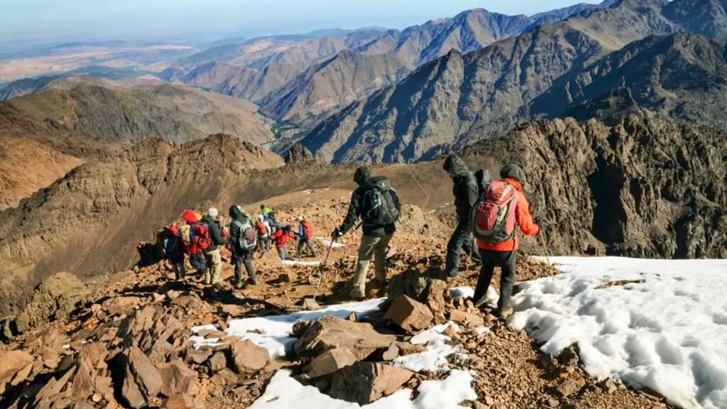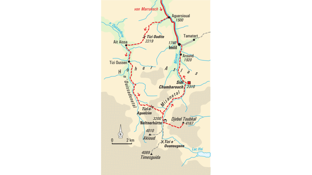 <Wir brechen früh auf, noch vor den ersten Sonnenstrahlen. Der Weg ist nicht ausgesetzt, führt aber manchmal über loses Geröll und Blockgestein. Bis in den Frühsommer ist mit der Querung von Schneefeldern zu rechnen. Bei der Gipfelrast schweift unser Blick bei guter Sicht bis in die südmarokkanische Wüstenebene hinunter und auf die 4.000er-Kämme um uns herum. Nach dem Abstieg erreichen wir wieder unseren Lagerplatz, wo unser Koch mit einem Mittagessen auf uns wartet. Der weitere Nachmittag steht zur freien Verfügung. Wer am Gipfelaufstieg nicht teilnehmen möchte, kann gemütlich das Hochtal zwischen den schroffen Bergkämmen durchstreifen oder der Aussicht wegen über einen gut begehbaren Weg zum Tizi-n-Ouanoums (3.700 m) oder Tizi n´Ouagane (3.800 m) wandern. -