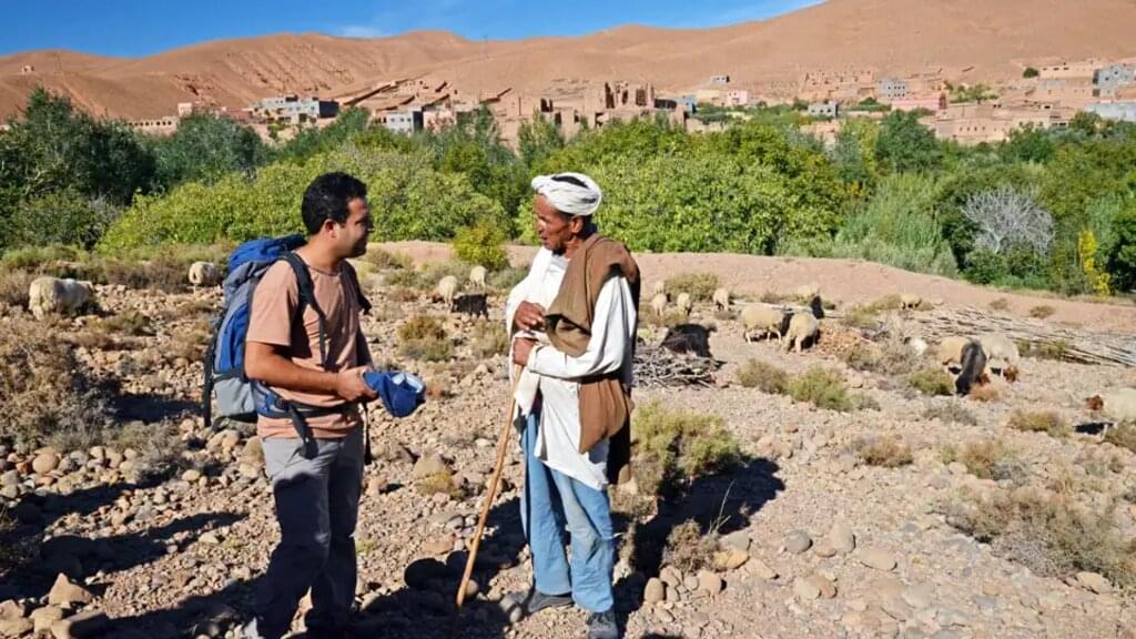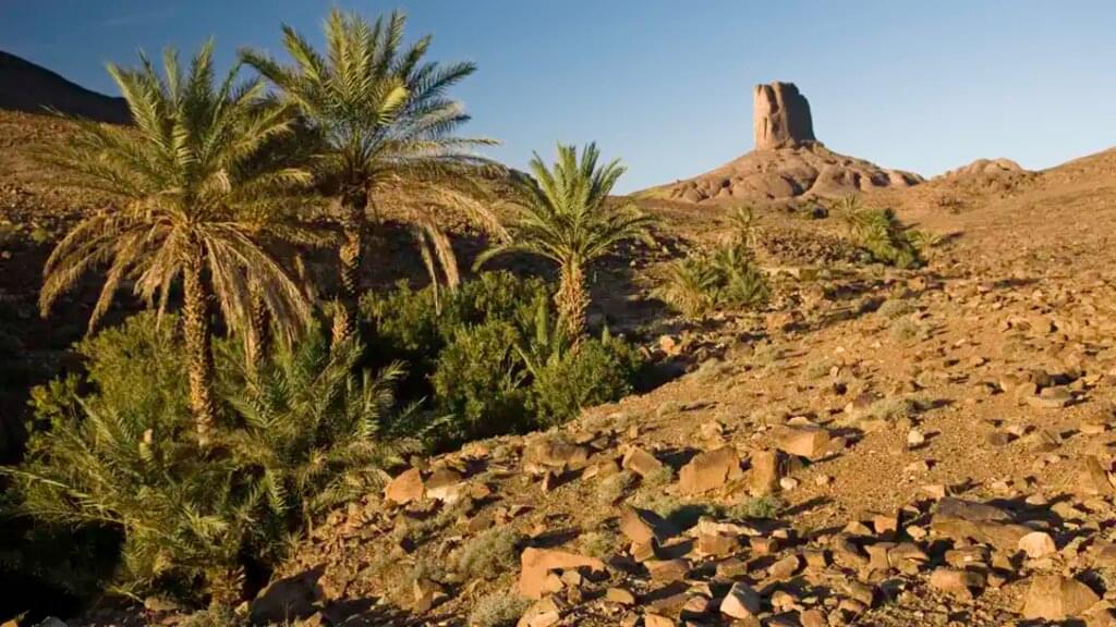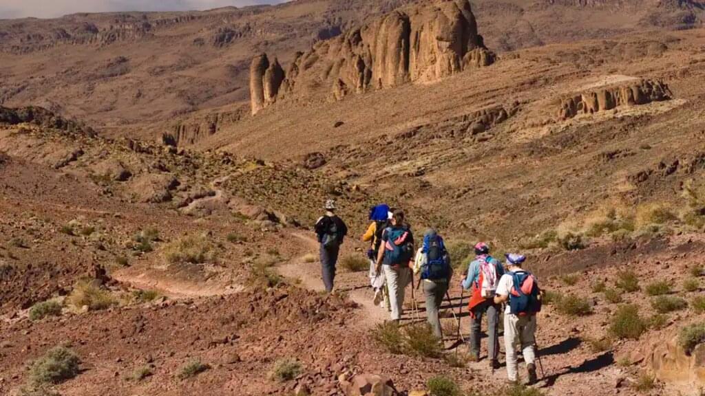 <Über ein Plateau wandernd ist unser erstes Ziel der Aussichtsberg Kouaouch (2.592 m). Der Gipfel bietet eine Rundumsicht ins Saghro-Gebirge und auf den Hohen Atlas. Wir wandern zwischen gewaltigen Tafelbergen mit bizarren Erosionsformen hindurch. Schließlich treffen wir in der Oase Igli (1.700 m) ein und schlagen, von einer Felskulisse umgeben, die Zelte auf. Diese Region ist zeotweise von Nomadenfamilien besiedelt, die in dem kargen Weideland von der Schaf- und Ziegenzucht leben. -