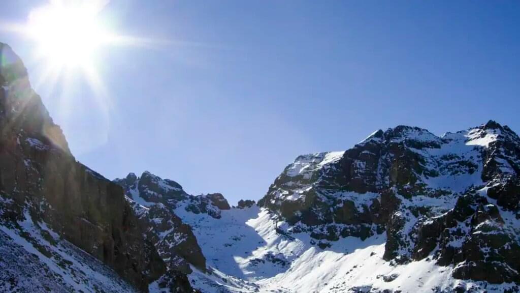 <Nach dem Frühstück teilen die Mulitreiber unser Gepäck auf und wir beginnen unser Trekking. Durch das Ait Mizane-Tal geht es zum Schrein von Sidi Chamarouch (2.350 m). Zu Ehren eines Heiligen, dem vom Volk magische Kräfte zugeschrieben werden, ist hier eine kleine Wallfahrtsstätte. Abhängig von den Schneeverhältnissen wird unser Gepäck von den Maultieren auf Träger verteilt. Der Pfad führt uns in Serpentinen weiter den Berg hinauf, es wird steiler und anstrengender. Schließlich erreichen wir das Toubkal Basecamp und die Neltner-Hütte (3.200 m). Am Nachmittag demonstriert uns unser Guide, wie man sicher mit Steigeisen und Eispickel umgeht. Nach ein paar theoretischen und praktischen Übungen fühlen wir uns fit für die kommenden Etappen. -