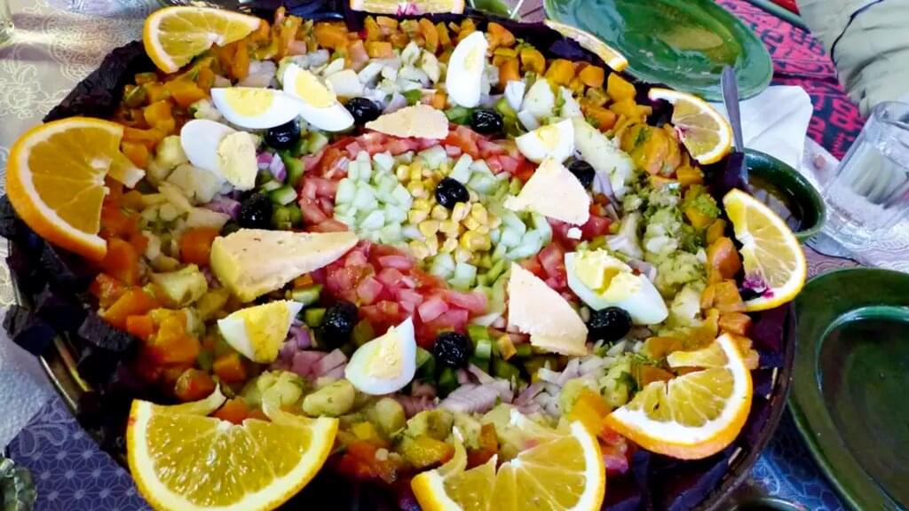 Bei dieser Reise ist am Anfang und Ende Halbpension inkludiert, während dem Trekking Vollpension. An den Trekkingtagen bereitet unsere Begleitmannschaft die Mahlzeiten in den Unterkünften zu. Morgens steht Brot, Marmelade und Margarine sowie Tee und Kaffee zur Verfügung. Außerdem wird morgens des Öfteren Müsli oder Porridge gereicht. Während der Mittagsrast picknicken wir in der Natur; meist wird eine bunte Salatplatte mit Brot sowie Käse, Thunfisch o.ä. gereicht. Abends bereitet der Koch eine warme Suppe und ein Hauptgericht zu, das abwechselnd aus den Nationalgerichten Tajine und Couscous oder aus Nudeln mit Beilagen, Gemüse o.ä. besteht. Zum Abschluss gibt es einen kleinen Nachtisch und traditionellen Pfefferminztee. Die Speisen werden mittags auf Matten auf dem Boden sitzend, eingenommen. Bei Lebensmittelunverträglichkeiten bitten wir Sie, sich selbst um entsprechendes Essen zu kümmern. Vegetarisches Essen ist nach Voranmeldung möglich, veganes Essen ist leider nicht umsetzbar. Wir bitten um Verständnis!