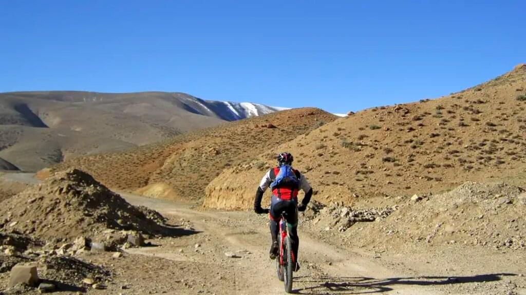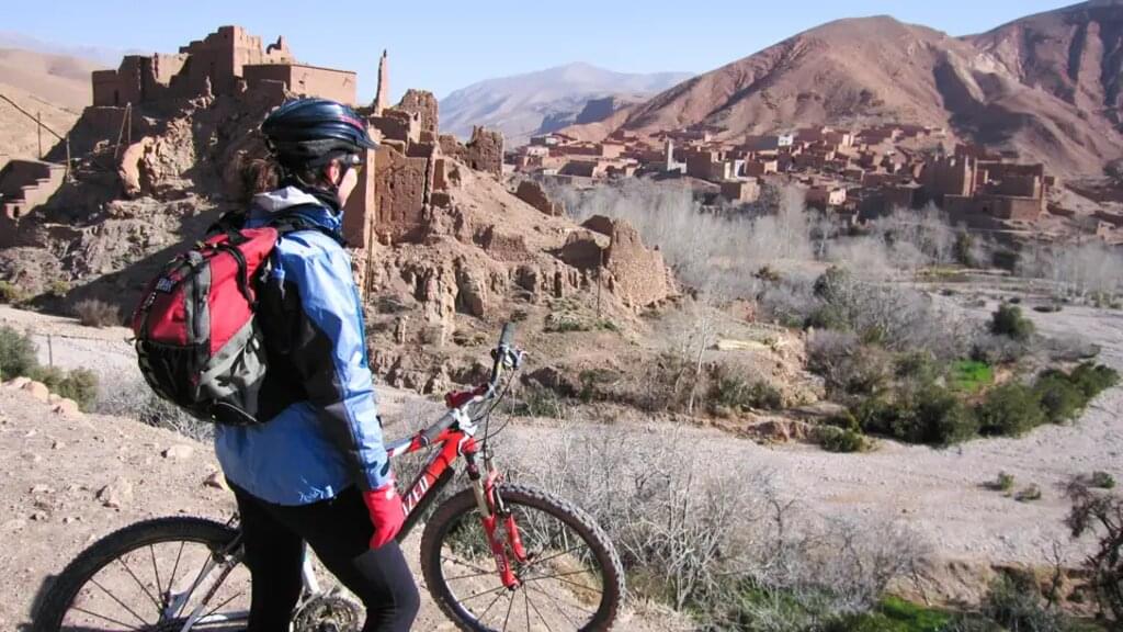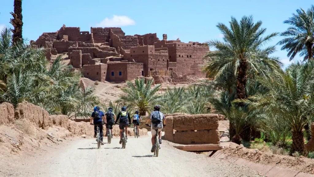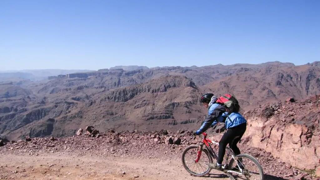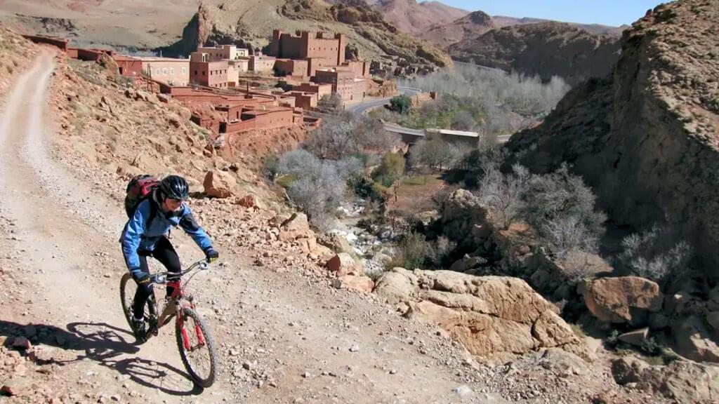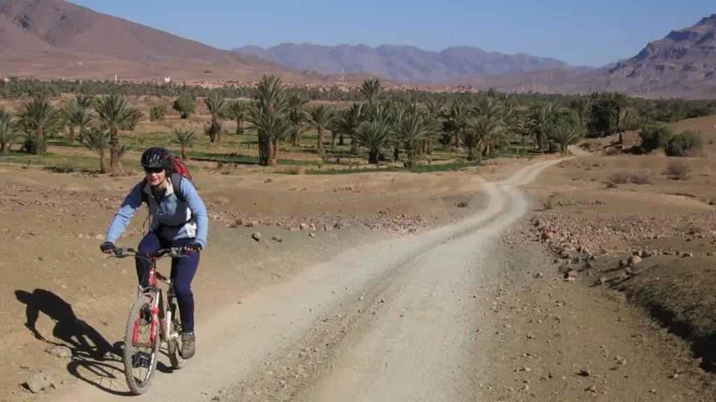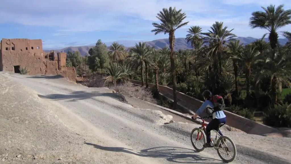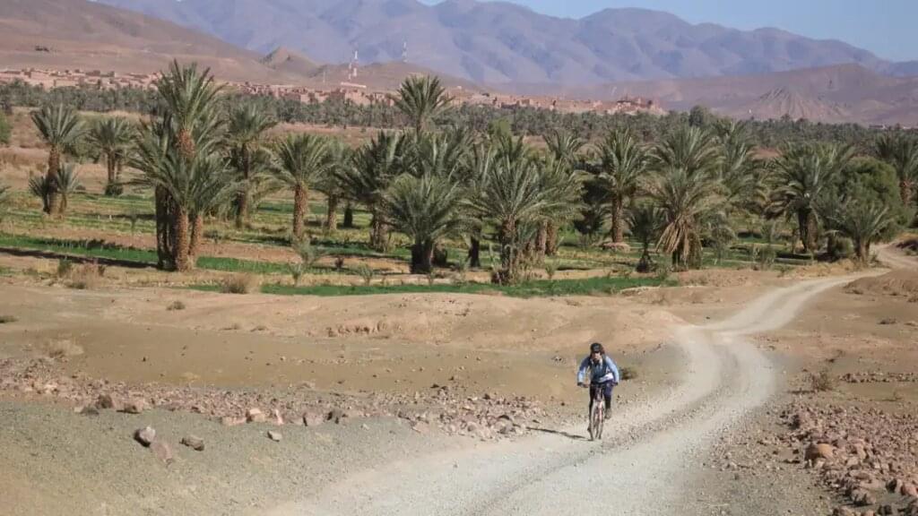 <Nach dem Frühstück führt ein kurzer Transfer zum Dorf Tagadilt. Von hier aus biken wir auf einer Piste etwa 20 km durch eine schöne Landschaft, passieren kleine Dörfer und Oasen, und nähern uns dem wunderschönen Jebel Sarhro Massiv. Vom Dorf Azemrane aus beginnen wir unsere Überquerung des Jebel Sarhro mit einem Anstieg, der wohl zu den schönsten der Welt zählt. Eine Serie von Serpentinen bringt uns auf eine einsame und ruhige Hochebene, von der aus wir einen schönen Blick auf den Berg Amalou n'Mansour genießen können, der mit 2.712 Metern die höchste Erhebung des Jebel Sarhro Massivs bildet.Von hier aus setzen wir unseren Aufstieg in ein wüstenhaftes und unberührtes Nomadenland fort und erreichen so den Kamm Tizi n'Tazazert (2.270 m). Durch eine Landschaft mit flachen Tafelbergen und tiefen Schluchten windet sich der Weg 16 km hinab durch eine felsige Landschaft, gekrönt von den fantastischen Felsformationen von Bab n'Ali. Diese berühmten Zwillingsfelsentürme sind das Wahrzeichen des Jebel Sarhro Massivs. In der Nähe befindet sich eine gemütliche Herberge, wo es erfrischende, eiskalte Getränke zu kaufen gibt. Die Straße durch das Jebel Sarhro Gebiet wird derzeit verbessert. Die Fahrt wird ab hier nun sanfter und führt durch einen Talgrund mit Mandelbäumen und Oasen. Ein letzter kurzer Anstieg bringt uns ins Draa Tal zu unserem heutigen Tagesziel, nach N¿Kob. Von der Hotelterrasse genießen wir eine wunderschöne Aussicht auf den Palmenhain einer Oase. -