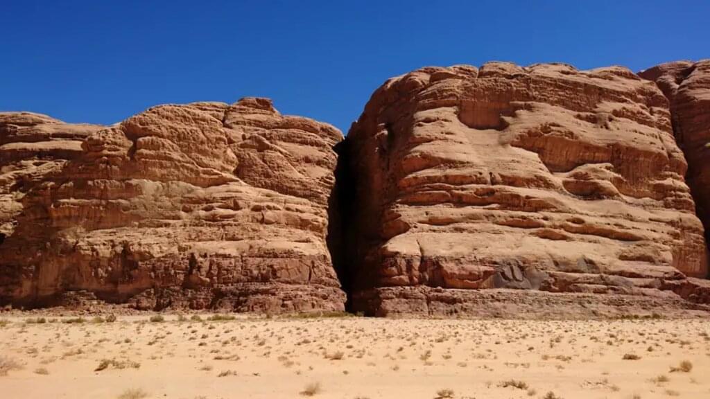 <Heute Morgen werden wir mit Jeeps durch die fantastische Landschaft des Wadi Rum zum Fuß des Dschabal Umm ad-Dami gebracht. Er ist mit 1.854 Metern der höchste Gipfel Jordaniens und bietet ein atemberaubendes Panorama. Wir steigen hinauf auf den Gipfel und genießen von oben die außergewöhnliche Perspektive auf die Wüste. Von hier können wir auch schon einen ersten Blick auf das Nachbarland Saudi-Arabien werfen, die Grenze ist nur wenige Kilometer entfernt. Wieder unten angekommen erwarten uns die Jeeps und bringen uns zur nahegelegenen Grenze. Wir betreten nun das Land, welches wir erst vor wenigen Stunden von oben schon gesehen haben: Saudi-Arabien. -