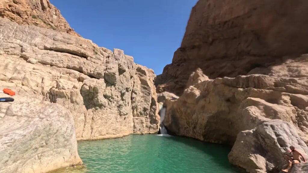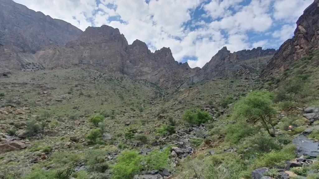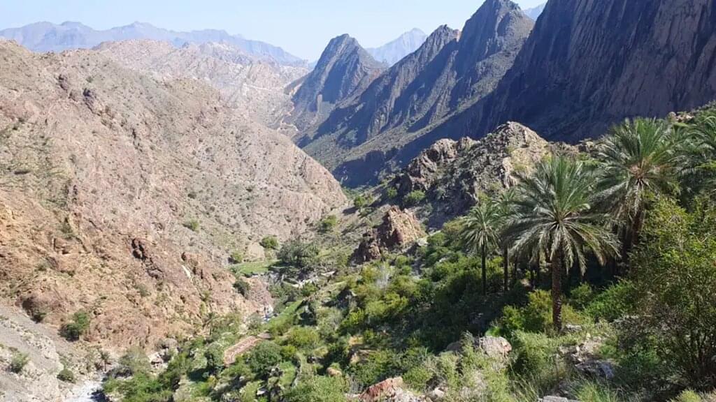 <Direkt von unserem Gästehaus aus wandern wir durch die Gassen der Oase Bimah, zwischen Steinhäusern hindurch tiefer hinein in das grüne Tal. Über kleine Pfade und jahrtausendealte Falaj-Bewässerungskanäle steigen wir auf zum typisch omanischen Bergdorf Salma, umgeben von vielen Gärten mit Dattelpalmen, Bananen und Mangos. Wir steigen auf Serpentinen hinab zum Dorf Balad Sit, einem der schönsten Dörfer des Hadschar-Gebirges. Nachdem wir eine kleine enge Schlucht durchwandert haben, holen uns die Fahrer ab und fahren uns auf einer interessanten Bergroute hinauf zum Jebel Shams. -