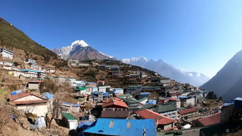 <Weiter nordwärts überqueren wir mehrmals den Fluss auf langen Drahtseilbrücken. In Jorsale befindet sich der Eingang zum Sagarmatha-Nationalpark. Nach insgesamt 3 - 4 Std. Gehzeit stromaufwärts erreichen wir den Zusammenfluss von Nangpo und Imja zum Dudh Kosi (2.850 m). Hinter der Stahlbrücke über die Imja-Schlucht bewältigen wir in etwa 2 Std. den steilen Aufstieg zum berühmten Sherpa-Zentrum Namche Bazar (3.440 m). Wir richten uns in unserer Lodge ein und können noch einen Rundgang durch die Geschäfts- und Souvenirstraße unternehmen. -