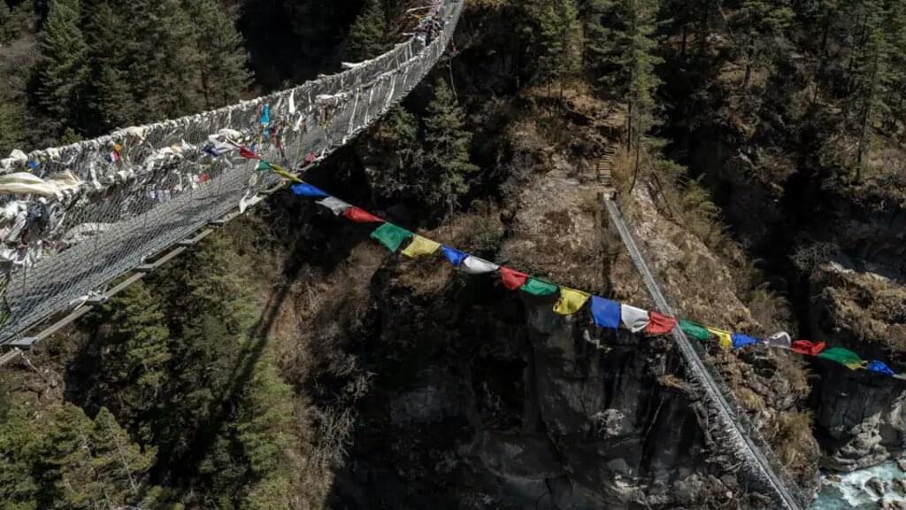 <Vormittags wandern wir entlang des Dudh Kosi über Benkar (etwa 1 Std.) nach Monjo, vorbei an Tannen und Magnolien und durch Rhododendronwälder. Am Ortsausgang von Monjo passieren wir den Police-Check-Post am Eingang zum Sagarmatha-Nationalpark. Während der Kontrolle bietet sich die Gelegenheit dem Gemeindehaus von Monjo einen Besuch abzustatten. Das 2019 vollendete Bauprojekt wurde von der Sir Edmund Hillary Stiftung Deutschland, Hauser Exkursionen und The Greater Himalayas Foundation unterstützt. Nach Monjo steigt der Weg zuerst leicht an, führt über die Hillary-Hängebrücke über den Bhote Kosi und dann auf einem guten, aber steilen Weg aufwärts ins Sherpa-Zentrum Namche Bazar (3.440 m), dem wichtigsten Ort im Khumbu-Gebiet. Wir richten uns in unserer Lodge ein und können noch einen Rundgang durch die Geschäfts- und Souvenirstraße unternehmen. -