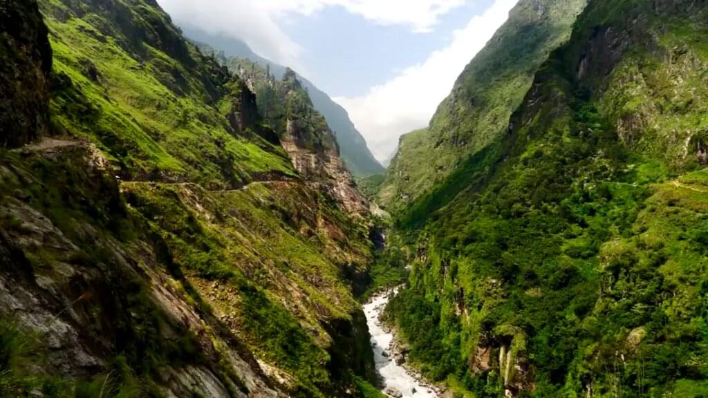 <Ein Kleinbus bringt uns bis nach Besisahar. Dort wechseln wir in Jeeps und fahren den Rest der Strecke entlang des Flusses Marsyangdi bis in das Dorf Timang. Von hier haben wir einen schönen Blick auf das ganze Manaslu-Massiv und starten am Nachmittag unser Trekking. In stetigem Auf und Ab wandern wir über Koto bis zum 2.670 m hoch gelegenen Verwaltungsort Chame, wo wir die Nacht in einer Lodge verbringen. -