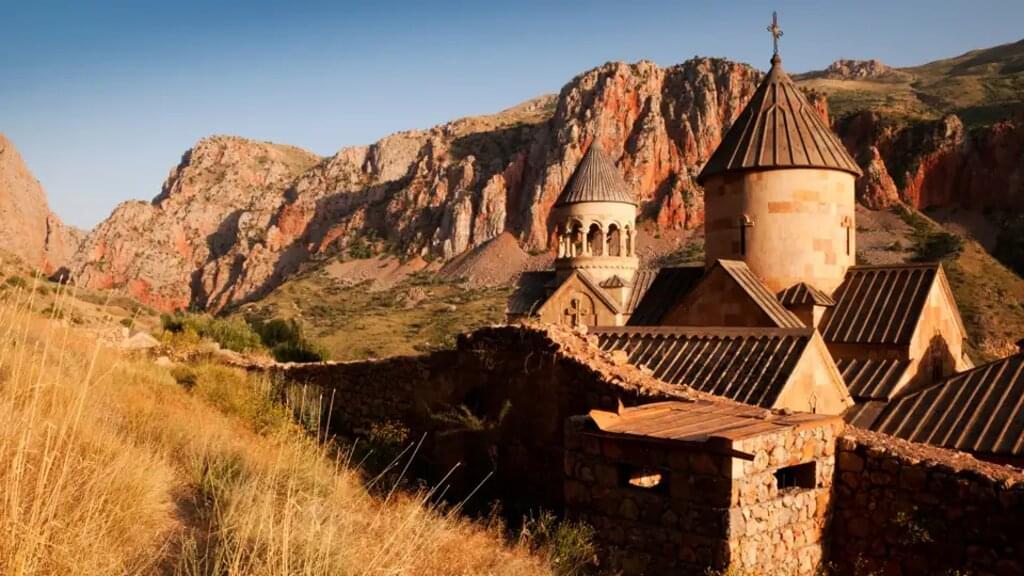 <Unser erstes Tagesziel ist heute das Kloster Chor Virap, einer der wichtigsten Wallfahrtsorte Armeniens. Das Kloster liegt in unmittelbarer Nähe zur türkischen Grenze und wir haben einen herrlichen Blick auf den Berg Ararat, der hier zum Greifen nah erscheint. Entlang der Grenze und im letzten Stück über eine schmale Straße durch eine enge, felsige Schlucht fahren wir dann in das Dorf Amaghu in der Region Wajoz Dsor. Zu Fuß steigen wir hinab in die Schlucht – die Umgebung erinnert an den amerikanischen Westen – und zum Ende der Wanderung hinauf zum Kloster Norawank (13. Jh.), ein Bauwerk aus rötlichem Stein, das malerisch auf einer Anhöhe vor den zerklüfteten Felsen steht. Mit etwas Glück erspähen wir unterwegs eines der seltenen und scheuen armenischen Mufflons. Nach dem Mittagessen brechen wir auf und fahren nach Goris, einer im Süden des Landes in einem grünen Talkessel gelegenem Kleinstadt. -