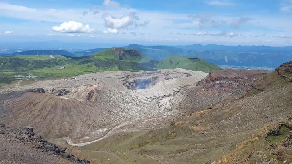 <Gleich nach dem Frühstück beginnen wir unsere Wanderung im "Land des Feuers". Der Nationalpark rund um den Aso-Vulkan gehört mit seinen Vulkankegeln zu den größten Einbruchskesseln der Erde. Wir wandern zum Vulkan Taka-dake (1.592 m) und folgen den Rauchzeichen langsam bis zum Kraterrand. Oben angekommen bietet sich ein atemberaubendes Panorama über die Caldera und die ganze Insel Kyushu. Mit diesen Eindrücken steigen wir wieder hinab und machen uns auf den Weg ins Aso-Vulkan-Museum – wie sind diese gewaltigen Berge entstanden? -