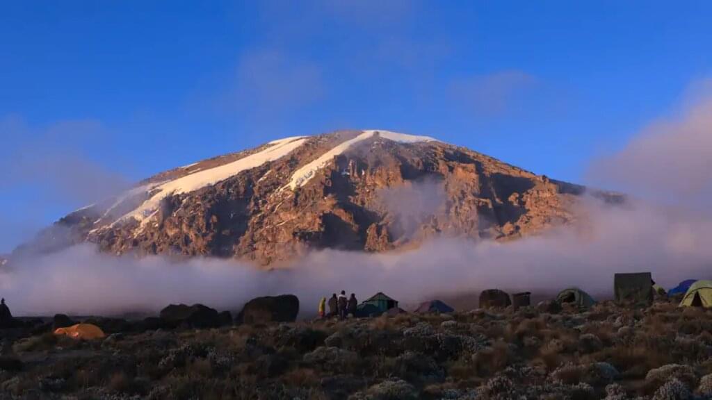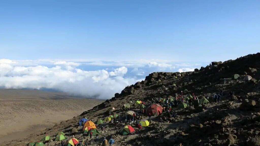 <Der heutige Tag ist aufgrund der zu überwindenden Höhenmeter anstrengend, aber der Akklimatisierung sehr zuträglich, da sich die Schlafhöhe nur um 115 Höhenmeter erhöht, wir aber etwa 850 Höhenmeter bis zum Lava Tower aufsteigen. Zunächst führt der Pfad gleichmäßig ansteigend in die alpine Wüste, bis wir auf 4.600 m zum Mittagessen den Lava Tower erreichen. Den mächtigen Kibo haben wir zum Greifen nahe bis zum Lava Tower immer im Blick. Wir gehen in südlicher Richtung auf dem Southern Circuit wieder bergab zum Barranco Camp (3.900 m), wo unsere Zelte bereits aufgestellt sind. Umgeben von Senecien genießen wir die Aussicht auf Western Breach, Heim- und Deckengletscher. -