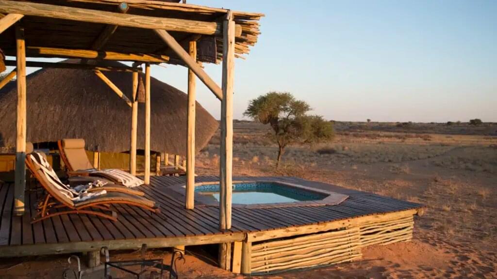 <Sie genießen die Einsamkeit des Camps bei einem leckeren Frühstück, das Ihr Guide für Sie zubereitet. Mit etwas Glück können Sie Zebras oder Gnus, die sich morgens gerne an der Wasserstelle aufhalten, beobachten. Danach brechen Sie auf und treten den Rückweg zur Lodge an. Ihr Weg führt Sie aus der Dünenregion in die für die Kalahari typische Strauch- und Buschsavanne. Die Savanne bietet verschiedenen Antilopenarten wie Nyala und Impala Heimat. Die Länge der heutigen Wanderung bestimmen Sie selbst - Ihr Guide passt die Route auf Ihren Wunsch und die Tagestemperaturen an. Falls es für die Rückwanderung zu heiß wird, können Sie sich zurück zur Lodge fahren lassen. Am frühen Nachmittag erreichen Sie Ihre Lodge und können den restlichen Tag zur Entspannung am Pool nutzen und zur Tierbeobachtung an der Wasserstelle nutzen. -