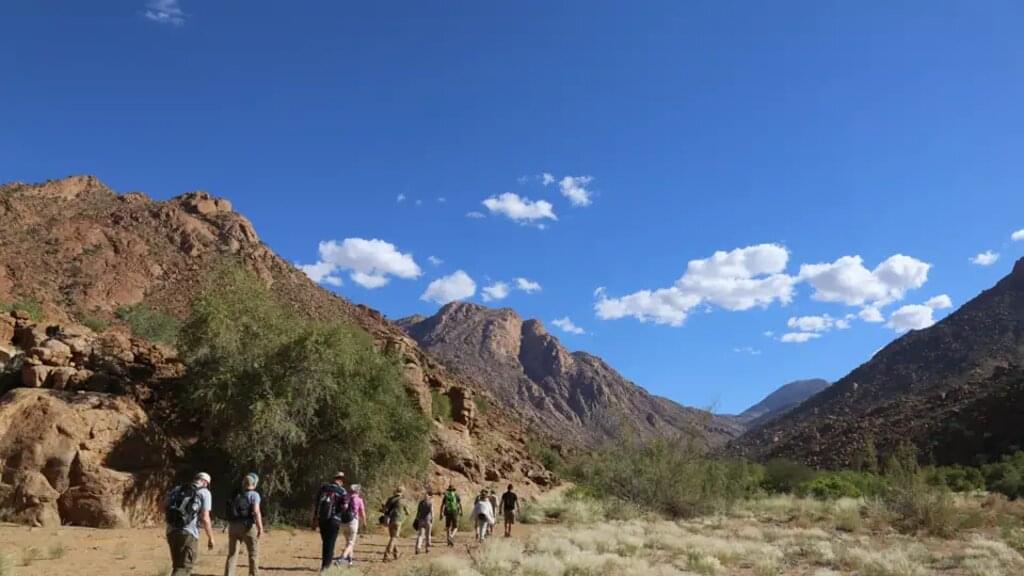 <Nach dem Frühstück starten wir in die nächste Wüstenlandschaft Namibias, zur Namib. Diese älteste aller Wüsten hat dem Land den Namen gegeben. Nach ca. 6 Stunden Fahrzeit erreichen wir das Namib Rand Naturreservat. Wir wandern nahe des Naturreservats entlang der rot-grauen Granitberge über ockerfarbenen Sand zu unserem heutigen Camp. Unser Gepäck wird transportiert und wartet bereits auf uns. Das Essen wird für uns bereits zubereitet und der erste leckere Duft macht sich breit. Die Nacht verbringen wir in warmen Feldbetten unter dem weit aufgespannten, funkelnden Sternenzelt (Matten, Schlafsack und Kissen werden gestellt). -