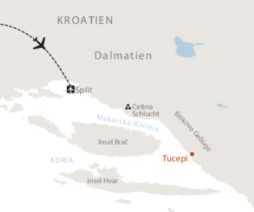 <Nach dem Frühstück fahren wir entlang der Küste in Richtung Omiš, hier starten wir unsere Panoramatour. Zunächst folgen wir dem alten Hirtenpfad, der uns auf den Sattel führt, von wo aus wir Blicke auf die Adria genießen können. Unterwegs erreichen wir die Schutzhütte Luda Kuća. Von nun an wandern wir stetig weiter, bis in Podašpilje unsere Wanderung endet.