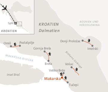 <Nach dem Frühstück fahren wir nach Makar, ein kleines Steindorf oberhalb von Makarska. Auf schmalen Pfaden steigen wir stetig bergauf durch Karstgelände und lichten Wald bis zum hochgelegenen Weiler Kruška. Unterwegs begleiten uns herrliche Ausblicke über die Küste und das glitzernde Meer. Nach einer kurzen Pause folgen wir einem aussichtsreichen Höhenweg, bevor wir über einen alten Abstiegspfad Veliko Brdo erreichen. Dort wartet ein liebevoll gedeckter Tisch mit regionalen Köstlichkeiten auf uns.