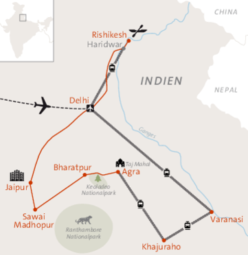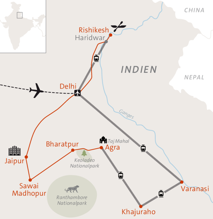 Auf dieser Erlebnisreise tauchen wir ein in das kontrastreiche Indien: pulsierende Metropolen, prachtvolle Paläste Rajasthans und das spirituelle Leben am Ganges erwarten uns. Wir erleben kulturelle Höhepunkte wie den Taj Mahal, das Rote Fort von Agra, die Tempel von Khajuraho, das Amber Fort und den Stadtpalast von Jaipur. Zu Fuß, mit Jeep, Fahrrad und Boot erkunden wir beeindruckende Landschaften, begegnen der Tierwelt in Nationalparks und erhalten authentische Einblicke in das Leben der Einheimischen vor Ort.