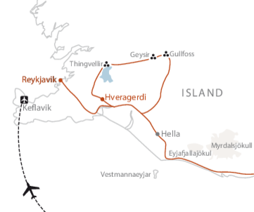 Du wirst am Flughafen Keflavik von einem Vertreter von ASI Reisen empfangen: Da mit verschiedenen Fliegern angereist wird, fällt ggf. etwas Wartezeit an. Bitte achte auf das ASI-Willkommensschild mit unserem Logo als Erkennungszeichen. Am An- und Abreisetag wird ein Sammeltransfer vom/zum Flughafen organisiert. Abfahrt am Anreisetag gegen 16h30 (späteste Ankunft am Flughafen Keflavik um 16h00). Bei Buchung der Frühmaschine (Ankunft um 08h40) muss die sehr lange Wartezeit am Flughafen bedacht werden. Alternativ kannst du dein Gepäck am Flughafen verwahren und den Bus ins Stadtzentrum nehmen (Fahrtdauer ca. 45 Minuten). Der Transfer am Abreisetag von Reykjavik zum Flughafen Keflavik (ca. 45 Minuten) erfolgt mit dem Flughafenbus. Bitte keine Abflüge vor 07h20 buchen.