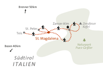 <Heute beginnt unser gemeinsames Abenteuer auf einem der eindrucksvollsten Bergwege des Villnössertals. Am Fuße steiler Dolomitenwände folgen wir dem berühmten Adolf-Munkel-Weg und genießen die wechselnden Ausblicke auf die mächtigen Geislerspitzen. Drei urige Almen säumen unseren Weg: von der Gschagenhardt Alm führt er weiter zur gemütlichen Glatschalm und schließlich zur Zanser Alm. Ein traumhaft entspannter Einstieg in die Woche!