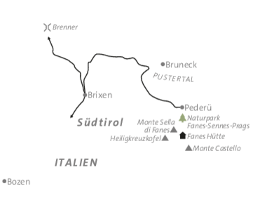 Tag 1Willkommen in den Dolomiten und Aufstieg zur Hütte<Am frühen Nachmittag begrüßt uns unser ASI Bergführer am Gasthof Pederü, am Ende der Zufahrtsstraße in den Naturpark Fanes-Sennes-Prags. Von hier steigen wir gemeinsam zur Faneshütte auf. Gepäck wird transportiert. Programmbesprechung der kommenden Tage und gemeinsames Abendessen.