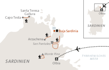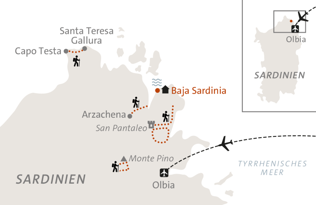 Nach unserer Landung in Olbia werden wir herzlich am Flughafen empfangen und zu unserem Hotel an der Costa Smeralda gebracht. Den Rest des Tages können wir nach Belieben gestalten – vielleicht mit einem ersten Bad im türkisblauen Meer oder einem Spaziergang am Strand, um in Ruhe anzukommen. Unser ASI-Bergwanderführer heißt uns offiziell erst am nächsten Morgen willkommen.