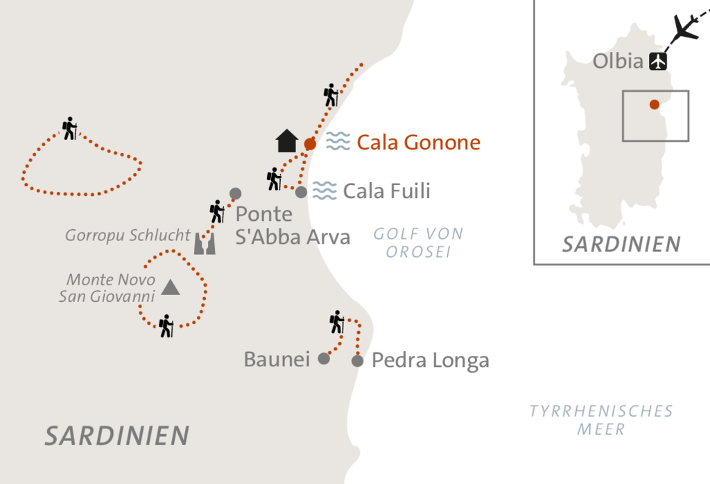 Für sportliche Alleinreisende, die Natur und Ursprünglichkeit fernab des Massentourismus erleben möchten, ist das bergige Hinterland an der Ostküste Sardiniens rund um Cala Gonone das ideale Reiseziel. Hier erleben wir Sardinien in seiner unberührten, ursprünglichen Schönheit – fernab jeglicher Touristenströme. Die Insel wird nicht umsonst als „Kontinent im Kleinen“ bezeichnet, denn die Landschaft ist unglaublich vielseitig. Markante Gipfel gehen in weitläufige Hochebenen mit bizarren Felsformationen über. Dichte, duftende Macchia wechselt sich mit stillen Almweiden ab, auf denen noch heute traditionelle Hirtenhütten stehen. Die Tier- und Pflanzenwelt ist ebenfalls außergewöhnlich. Wildschweine, Mufflons, Adler und zahlreiche seltene Blüten warten darauf, von uns entdeckt zu werden.