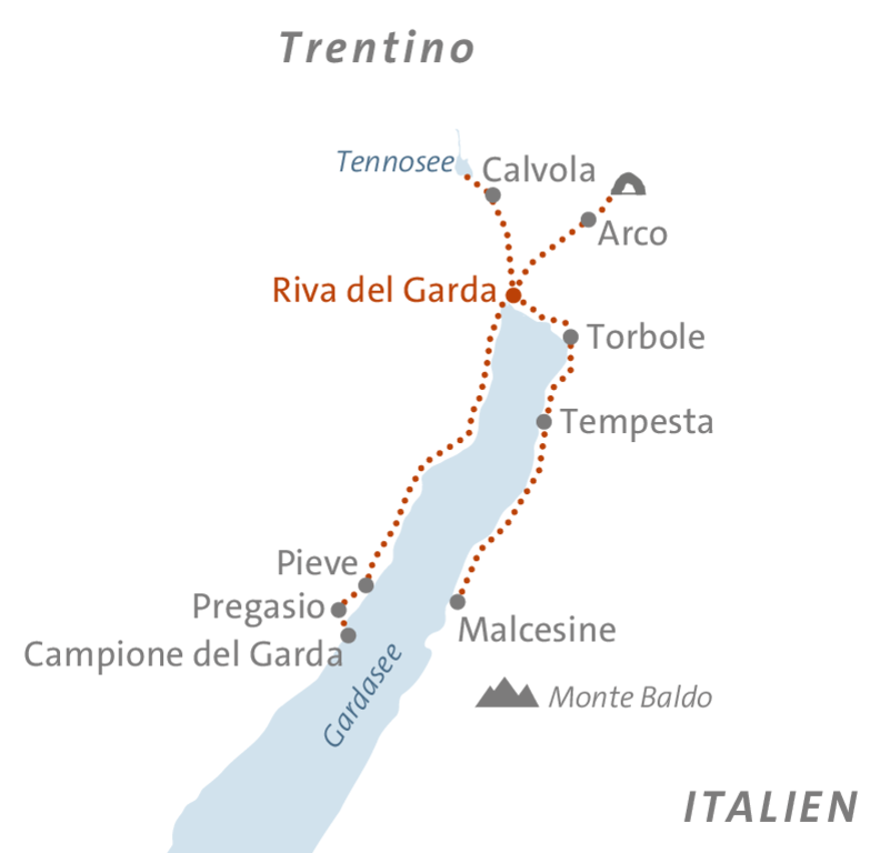 <Ein Seitenwechsel ans Westufer bringt uns in eine andere Welt. Von Campione del Garda - einer kleinen Ortschaft an der "Zitronenriviera" führt der Weg über alte Terrassenwege und durch schattige Wälder bergauf. Hinter Pregasio und Pieve öffnen sich spektakuläre Ausblicke über den See, die Felsen und das weite Blau. Die Höhen von Voltino schenken uns ein letztes grandioses Panorama, bevor wir wieder talwärts steigen.