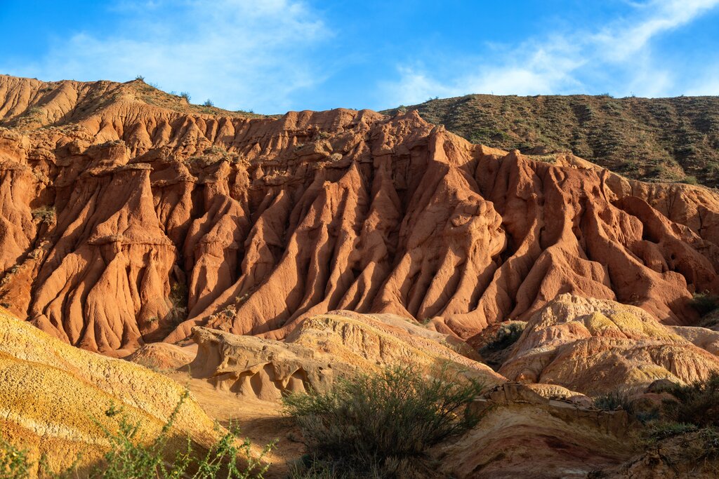 <Wir setzen unsere Fahrt nach Osten fort und besichtigen unterwegs in der Gegend der historischen Stadt Balasaghun den Burana-Turm, ein mittelalterliches Minarett aus der Zeit der Karakhaniden. Anschließend geht es weiter zur Schlucht von Kok-Moinok, wo wir eine Wanderung in einer Welt aus beeindruckenden Sandsteinformationen unternehmen. Im nahe gelegenen Ort Kochkor übernachten wir in einem einfachen Gästehaus.