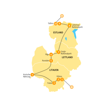 <Mit einem Koffer voller Vorfreude fliegst du heute in die Hauptstadt von Litauen, wo deine Reise durch das Baltikum beginnt. Voller Spannung erwartet dich deine Reiseleitung am Flughafen Vilnius und bringt dich zu deiner Unterkunft. Schon beim ersten gemeinsamen Spaziergang wirst du beeindruckt sein von der Altstadt mit ihren mittelalterlichen Gassen und imponierenden Bauwerken wie dem Großfürstenpalast, dem frei stehenden Glockenturm und dem Burgberg mit Gediminas-Turm als Symbol der Stadt. Verpasse nicht den Sonnenuntergang auf dem Burgberg mit herrlichem Blick auf Vilnius, gekrönt von der Abenddämmerung.