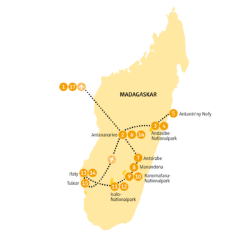 Nicht nur, dass hier an 300 Tagen die Sonne scheint, es riecht auch nach den Gewürz- und Vanillepflanzen, aus denen das Parfüm Ylang Ylang gemacht wird. Mach es auch so: Verdufte mit uns in eine Wolke des Glücks. Dorthin, wo Scharen von Lemuren durch Rosenholz- und Schraubenbäume turnen. Wo bizarre Landschaften in türkisgrüne Lagunen münden. Wo du nach blauen Saphiren suchst oder wie der Madagaskarfrosch in vulkanwarmen Tümpeln abtauchen kannst.