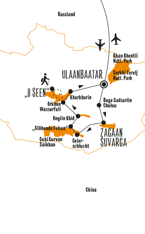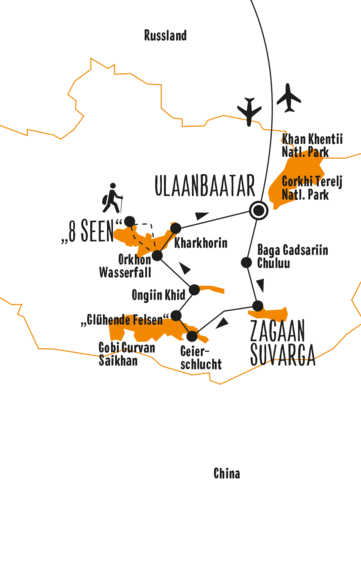 - Programm-Details: 10 Wanderungen, 1 Kamelritt, 1 Pferderitt, Stadtführungen in Ulaanbaatar und Karakorum, traditionelle Musik, Besuche bei Nomadenfamilien, Besuch buddhistischer Klöster