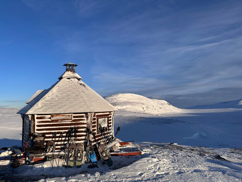 <Unsere erste Wanderung starten wir direkt vom Hotel aus. Vor dem Eingang schnallen wir die Schneeschuhe an und wandern vorbei an schneebedeckten Scheunen hinauf auf das Plateau des Golsfjellet. Wir gehen bei unserer Eingehtour erst über die Gipfel Store- und Veslejfell, später Richtung Süden leicht absteigend nach Kamben. In einer typisch norwegischen Grillhütte werden wir als Highlight unser Mittagessen gemeinsam grillen.