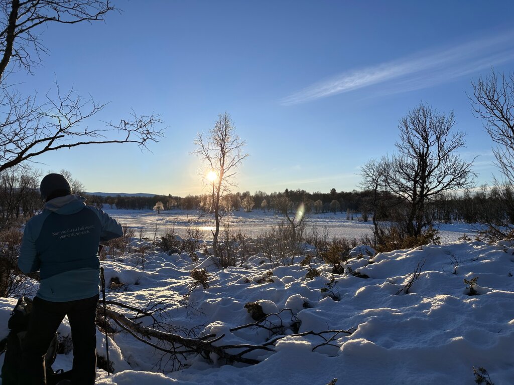 <Nur eine halbe Stunde von unserem Hotel entfernt und doch ein ganz anderer landschaftlicher Charakter. Das Nystöllsfellet ist ein langgezogener Bergrücken, auf den Höhen unbewaldet, durchsetzt von einigen Seen. Genussvoll wandern wir in einer sanftwelligen Landschaft höher. Auch heute sollte ein Gipfel nicht fehlen: Am Dugurdstjernet auf 1.262m bietet sich uns bei gutem Wetter ein Panorama, welches bis zu den Nationalparks Norwegens mit seinen markanten Gipfeln reicht. Auch heute werden wir wieder Holz und Grillgut mitnehmen und unser Mittagessen in einer Grillhütte zubereiten.