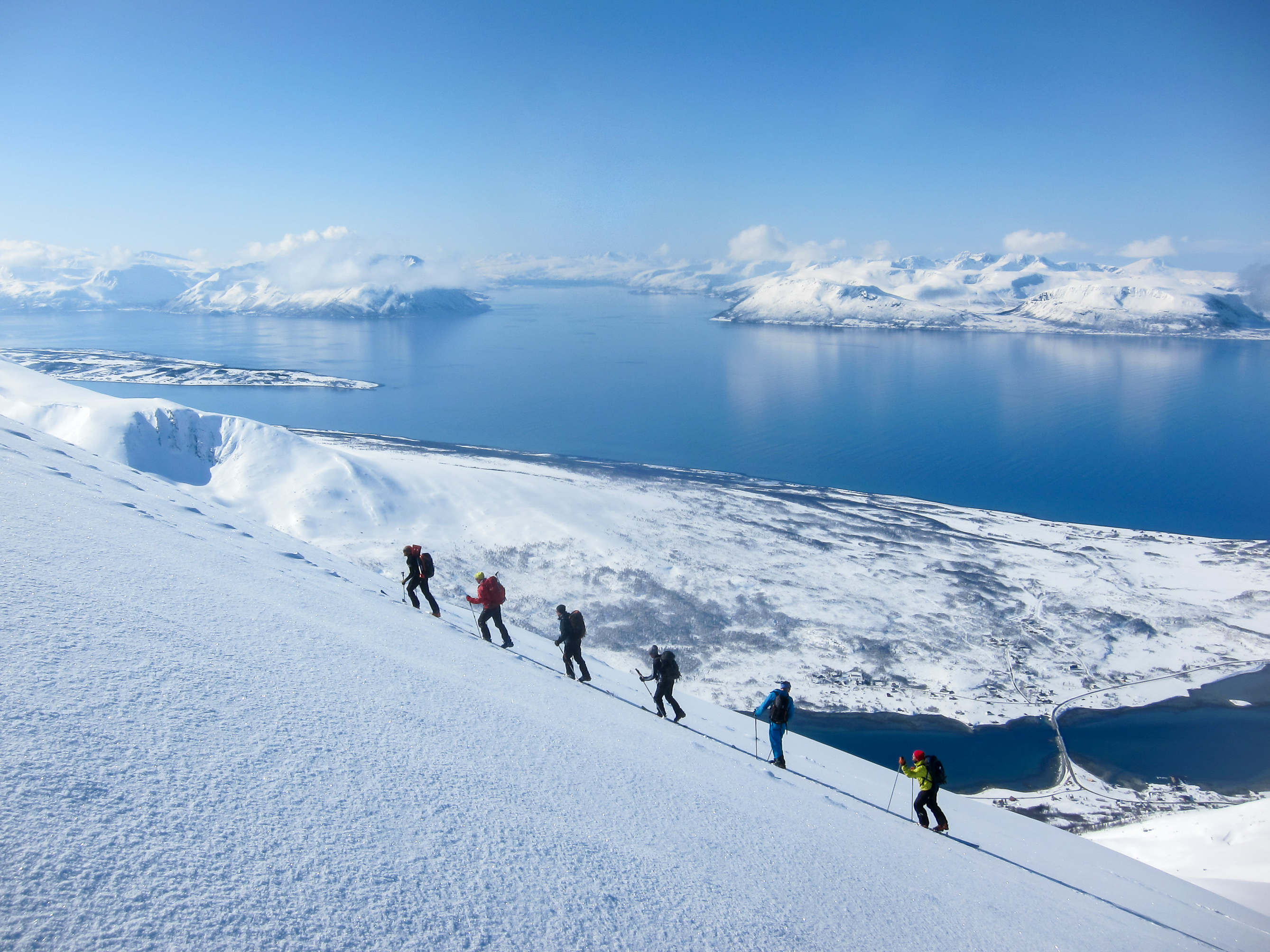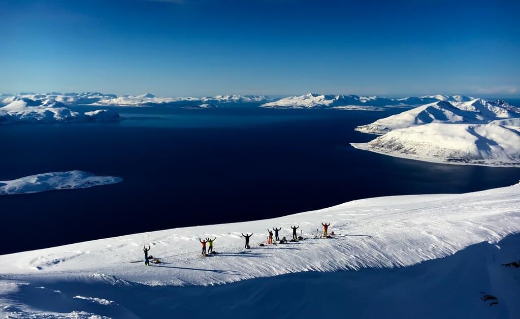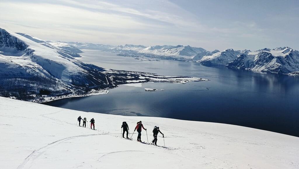 <Heute fahren wir nach Nordlyngen, wo uns eine beeindruckende Skitour auf den mächtigen Storgalten (1.219 m) erwartet. Schon beim Anblick dieses imposanten Berges mit seinen gewaltigen Rinnen und Hängen schlägt unser Herz höher. Am Gipfel angekommen lassen wir den atemberaubenden Ausblick auf uns wirken. Von hier oben haben wir einen fantastischen Rundumblick über die umliegende Bergwelt und die tiefen Fjorde Nordlyngens. Die Aussicht ist einfach überwältigend und belohnt uns für die Anstrengungen des Aufstiegs.