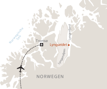 Tag 1Willkommen in Norwegen<Flug nach Tromsø. Am Flughafen wirst du von deinem ASI Bergführer abgeholt und es erfolgt ein ca. 2-stündiger Transfer nach Lyngseidet in unsere idyllisch gelegene Unterkunft. Bei einem gemeinsamen Abendessen lernen wir uns kennen.