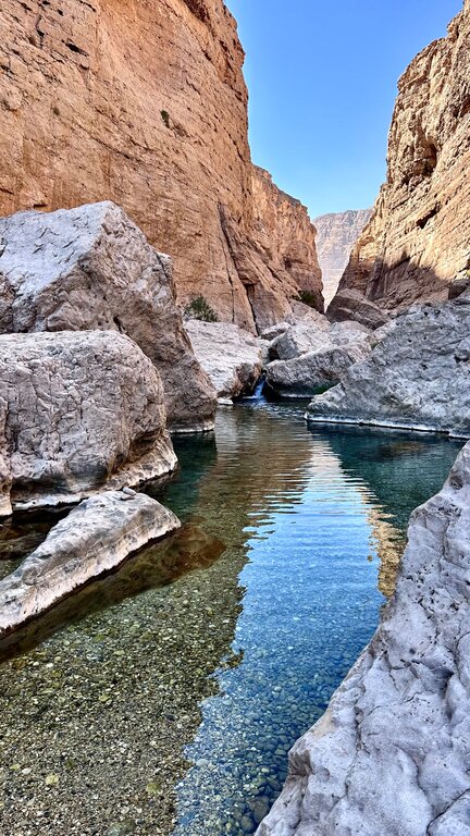 <Nach dem Frühstück fahren wir in das Dorf Al Alya, das tief im Wadi Bani Kharus liegt. Wir wandern in Richtung Ad Dar, durch die üppigen Gärten der Oase und schließlich wieder zurück zum Ausgangspunkt. Schließlich erreichen wir Bimah, wo wir die Nacht im Gebirge des Jabel Shams verbringen werden.