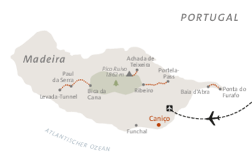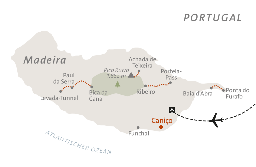 <Madeira ist die Insel der tausend Levadas – heute wandern wir auf einem ihrer schönsten Wasserwege. Entlang der berühmten Forellenlevada (Levada do Furado) tauchen wir bald in eine urwüchsige, sattgrüne Landschaft ein. Über uns ragen Lorbeerbäume und Baumheide, während wir durch Felsdurchbrüche und kurze Tunnel immer tiefer in den dichten Wald vordringen. Die üppige Vegetation und das allgegenwärtige Plätschern des Wassers verzaubern uns auf Schritt und Tritt. Schließlich erreichen wir den Portela-Pass, wo wir in einem typischen Lokal einkehren – ein gemütlicher Abschluss dieser herrlichen Wanderung.