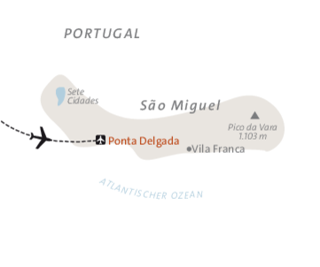 <Flug nach São Miguel. Am Flughafen wirst du von einem ASI Vertreter abgeholt und in das Hotel gefahren.